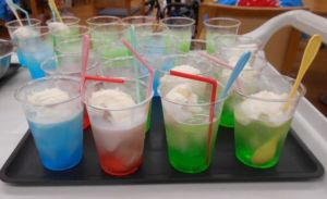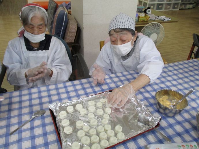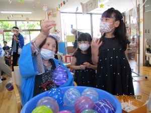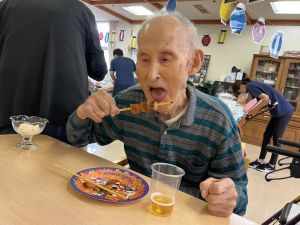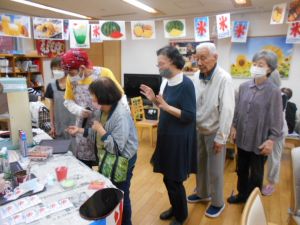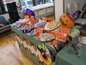 秋の収穫祭として、芋を掘って輪の中に投げ入れるゲームを行い、盛り上がりました。ミニおやつバイキングでは、マドレーヌやゼリー、ポップコーンなど様々な中から好きなものを選び、楽しいひと時を過ごしました