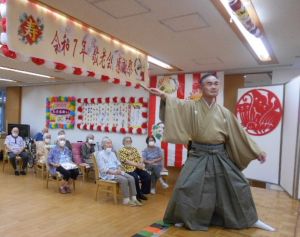 男性職員が鬼にになって、福引を皆さんに引いてもらい鬼退治ゲームで豆まき気分を味わっていただき、桃太郎ゲームで鬼退治をしました。皆様楽しそうにゲームに参加し笑顔がたくさん見られ温かい雰囲気での立春を過ごされました。