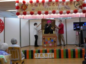 9月20日(土)敬老感謝祭を行いました。 長寿祝いの皆様のご紹介と記念品贈呈の後、大演芸会と称し、本格日本舞踊、歌と踊りの祭典、大仕掛けのマジックショー、夫婦漫才等、利用者様と一緒に楽しみました。